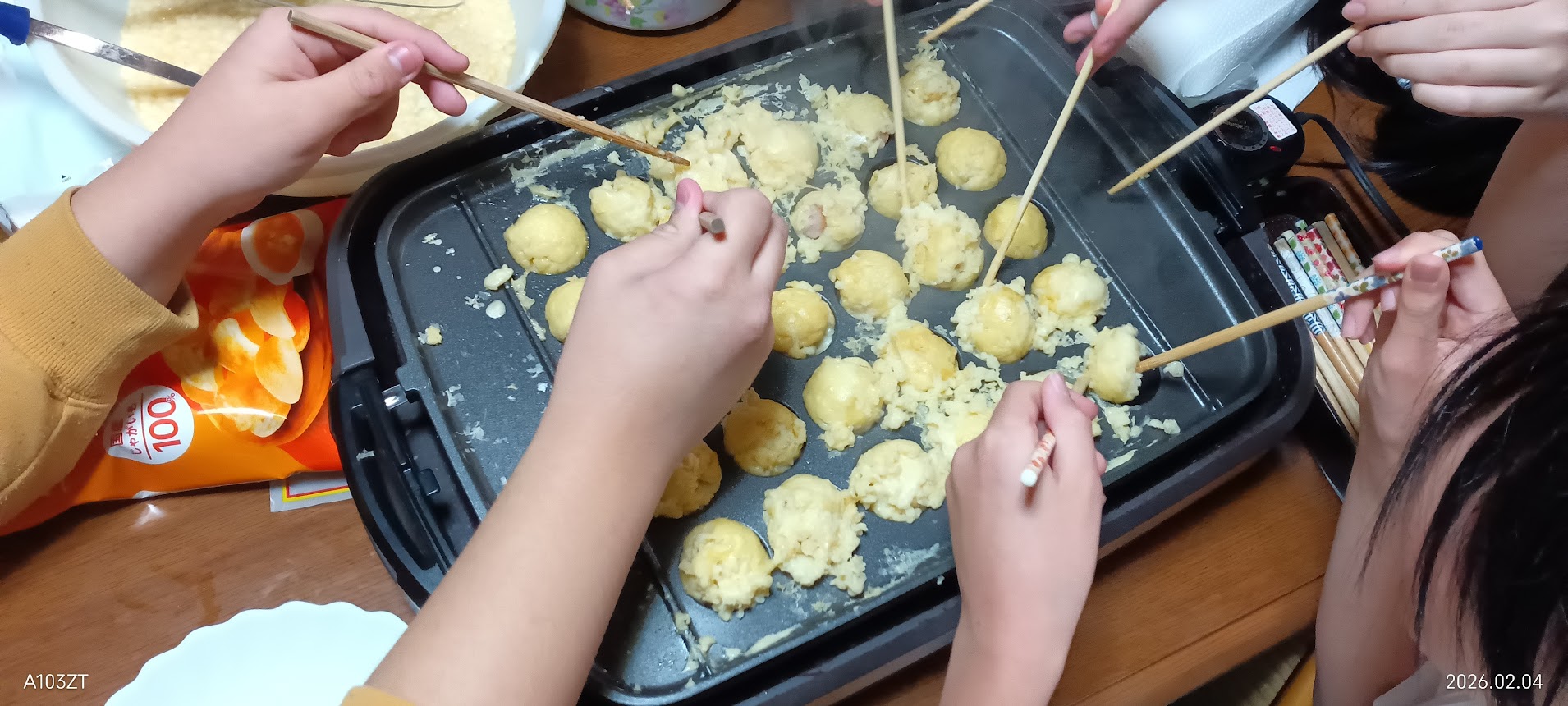 2026年02月05日(木) ひとのまブログ 宮田 隼 たこパ ひとのまでは月水金曜日とみんなで晩ご飯を食べています。 お金があってもなくても食べられます。 この日はたこ焼き。たこ焼きはみんなでワイワイ言いながらできるからいいですね。 こういう時心のどこかで「失敗しろ(笑)」と思っている自分がいるんですが(失敗した方が思い出に残ったりするから)、とてもおいしそうなたこ焼きができて大成功でした。